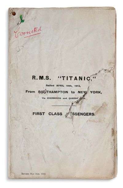 LISTE imprimée avec annotations et corrections manuscrites, R.M.S. “TITANIC”…, 1912 | titre et 66 pages in-fol. assemblées par une attache métallique (forte déchirure aux premiers feuillets, quelques taches et mouillures) | sous boîte-étui demi-maroquin bleu nuit | en anglais.
