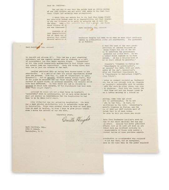 L.S. « Orville Wright », Dayton, Ohio 17 juin 1926, à Mark SULLIVAN à Washington | 3 pages in-4 dactylographiées, à son en-tête (traces de rouille d’un trombone et petites taches) | en anglais.