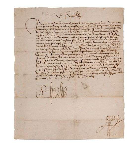 CHARLES VIII (1470-1498) Roi de France L.S. «Charles», Chinon 13 mai [1488 ou 1489], aux conseillers de la cour de parlement à Bordeaux| contresignée par Samont (?)| 1 page in-4, adresse au verso.