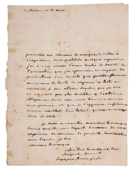 Joséphine à Florence. «Permettés moi Monsieur le marquis, de mêler à l'expression de la gratitude quelques reproches. J'ai à vous accuser d'avoir trahi le secret de l'admiration que j'ai eprouvée, en voyant les productions d'un des arts que possède Florence. Aurez vous la bonté de réparer ce tout en assurant à son altesse Royale, que je suis on ne peut pas plus sensible à l'extrème obligeance dont elle veut bien me donner une preuve, et que je l'apprécie infiniment comme résultat d'un talent qu'elle encourage dans ses etats»...