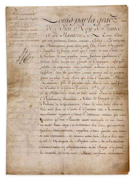 Plein pouvoir donné au marquis de Durfort pour négocier le mariage du Dauphin, futur Louis XVI, avec Marie-Antoinette. [Le mariage sera célébré à Vienne le 19 avril suivant, Durfort signant l'acte au nom du Dauphin.] «La tendresse que Nous avons pour nôtre petit fils Louis Auguste Dauphin de France, ainsi que l'interêt de nos Etats et le bonheur de nos peuples nous faisant également desirer de lui donner une epouse et compagne, afin qu'il puisse, en perpetuant nôtre posterité assurer à nos peuples la felicité dont ils jouissent, nous avons crû ne pouvoir faire un plus digne choix que de la Princesse Marie Antoinette, fille de feu nôtre très cher et très amé frere et cousin l'Empereur François Ier de glorieuse mémoire et de nôtre très chere et très amée soeur et cousine l'Impératrice douairière, Reine de Hongrie et de Boheme et respectivement soeur de nôtre très cher et très amé frere et cousin l'Empereur des Romains actuellement régnant»... Le marquis de Durfort a été chargé de faire la demande au nom du Roi, et «en qualité de nôtre Ambassadeur Extraordinaire et plenipotentiaire à ce specialement autorisé, conferer, négocier et traiter avec un ou plusieurs commissaires revetûs de pareils pouvoirs [...] d'arrêter, conclurre et signer en nôtre nom les articles et conventions de mariage [....], regler et accorder les dot, assignat et conventions d'iceux, convenir des termes du payement de la dot, donner et accepter de part et d'autre les promesses, obligations et sûretés qui seront nécessaires [...], comme aussi d'assister ensuite comme temoin de nôtre part aux cérémonies des fiançailles et des épousailles qui se feront en face d'Eglise»... On joint une chemise maroquin rouge ornée de fleurs de lys au dos et des armes royales sur les plats.
