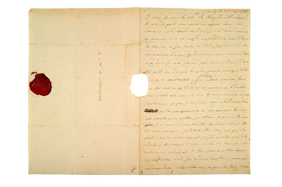 L.A.S. «Louis», Marly 25 mai 1778, à M. de MAUREPAS| 2 pages in-8, adresse avec cachet cire rouge aux armes (petit trou par bris du cachet avec perte de quelques lettres).