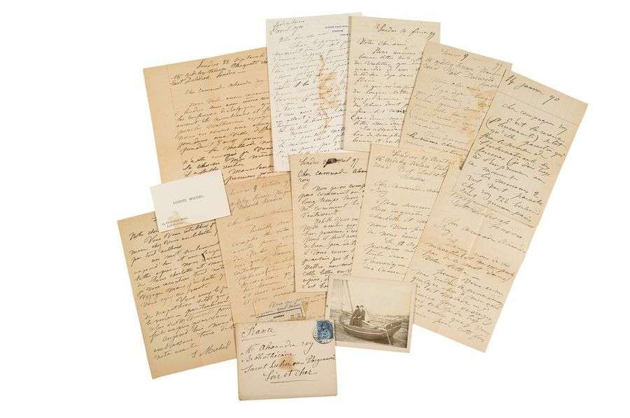 «C'est la revue (L'Humanité) sitôt qu'elle paraîtra qui fera le service de l'Internationale des femmes»| elle annonce la parution prochaine de ses Mémoires chez Roy... 15 janvier 1896. Prière d'envoyer quelque chose à son oncle, qui est malade. «Je termine mes ouvrages mais cela tarde trop»... 29 août 1896. Elle partira le 12 septembre pour l'Amérique, avec Charlotte VAUVELLE et «des camarades, nous y serons deux mois c'est pour des conférences au bénéfice de syndicats ouvriers»... 12 septembre 1896. Photographie originale du «frère de Charlotte avec moi», dans un petit bateau à voile, avec dédicace au dos| carte de visite jointe... 27 avril 1897. Elle relit son Histoire de la Commune... «Oui je vois de temps à autre KROPOTKINE aux réunions [...] Il n'a pas de photographie je crois que quand je le verrai je pourrai attraper son profil sans qu'il le voie pour vous. Oui j'envoie quelquefois au Libertaire»... 22 septembre 1897. «Nous voilà encore revenues à Londres sans avoir même commencé les conférences de Belgique qui eussent été nombreuses et fructueuses pour les malheureux Espagnols. Nous en avions une chaque jour dans une ville différente pendant 8 à 15 jours»... 9 octobre 1897. Prière de lui envoyer des éditions d'Homère| elle relit Lamennais... 15 novembre 1897. Elles reviennent à Paris. «Vous aurez le portrait de Kropotkine sitôt que je le verrai - par trahison»... 9 janvier 1899. «Avez-vous reçu l'Histoire de la Commune j'avais dit à Stock de l'envoyer»... 10 février 1899. «Oui je connais TAILHADE. Oui Le Peuple paraît ralliant les révolutionnaires dans quelques jours je leur enverrai une pièce de vers Le Peuple comme je le comprends»... 8 avril 1900. Annonce de leu