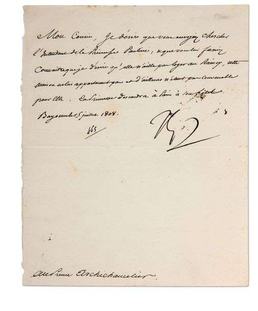 Sur sa soeur Pauline. «Mon Cousin, je désire que vous envoyiez chercher l'intendant de la Princesse Pauline, & que vous lui fassiez connaître que je désire qu'elle n'aille pas loger au Raincy, cette maison ne lui appartenant pas et d'ailleurs n'étant pas convenable pour elle. La Princesse descendra à Paris à son hôtel».