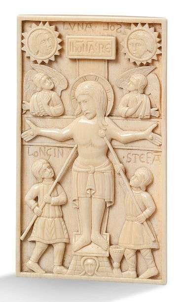 PLAQUETTE en ivoire sculpté en bas-relief à décor d'une Crucifixion avec saint Longin et saint Stéphaton au pied de la croix, inscriptions. Copie XIXe/début XXe siècle d'une plaquette italo-byzantine du XIIe conservée au musée de Berlin