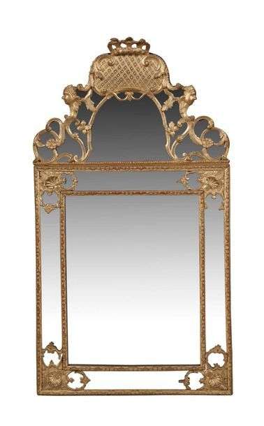 MIROIR À PARECLOSES en bois mouluré sculpté et doré à décor de coquilles et fleurettes. Le fronton, orné de profils et d'acanthes, est surmonté d'une couronne XVIIIe siècle