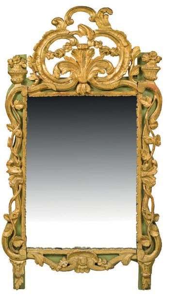 ø IMPORTANT MIROIR en bois sculpté doré et laqué céladon à décor ajouré de motifs rocaille, urnes fleuries, fleurons et palmettes.Travail Provincial, XVIIIe siècle