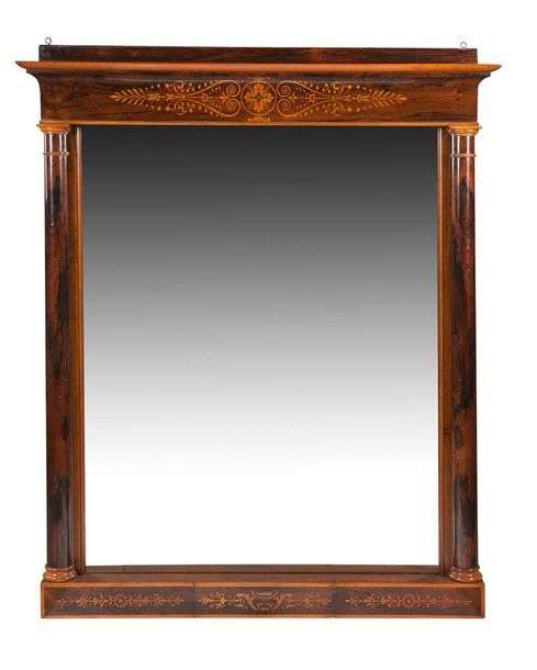 MIROIR en placage d'acajou et d'érable orné de deux colonnettes détâchées.