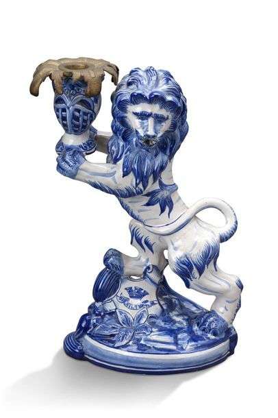 ø Bougeoir au lion héraldique en faïence bleue et blanche, bobèche en bronze. Marque sous la base