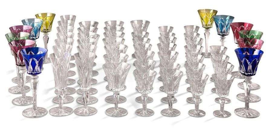 Service en cristal taillé modèle 68-I-1138, comprenant treize flûtes à champagne, douze verres à eau, douze verres à vin, et douze verres à liqueur, douze roemers en verre polychrome Marqués sous la base de certains