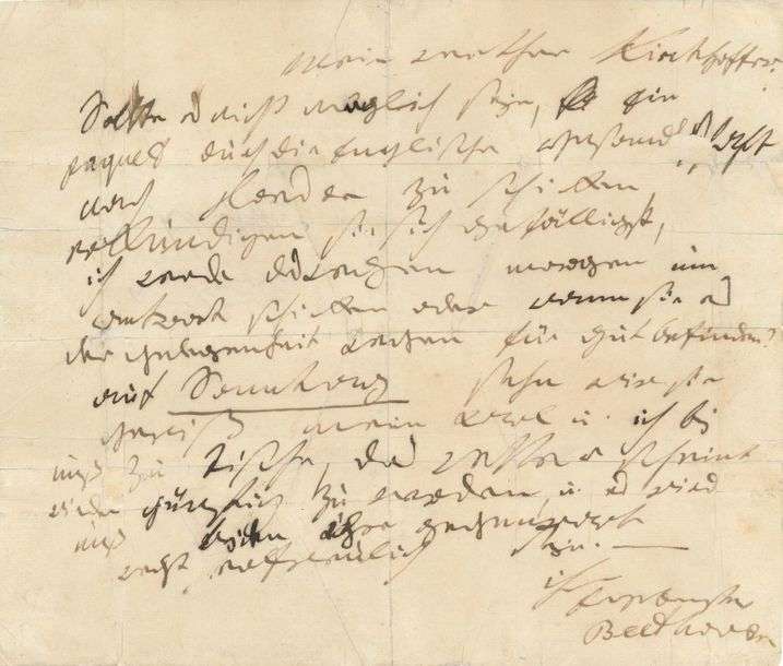 [Kirchhoffer était caissier à la banque Hofmann & Goldstein à Vienne, et il aida plusieurs fois Beethoven en 1823 à envoyer de la musique à leur ami Ferdinand RIES (1784-1838) à Londres, et à transférer de l'argent. Il s'agit ici d'envoyer à Londres à Ferdinand Ries la Missa solemnis op. 123, que Beethoven vient d'achever, dans le but d'y trouver un éditeur.] «Mein werther Kirchhoffer. Sollte es nicht möglich seyn, ein paquet durch die Englische Gesandschaft nach London zu schicken erkundigen sir sich gefälligst, ich werde deswegen morgen um Antwort schicken oder wenn sie es den Gelegenheit wegen für gut befinden ? auf