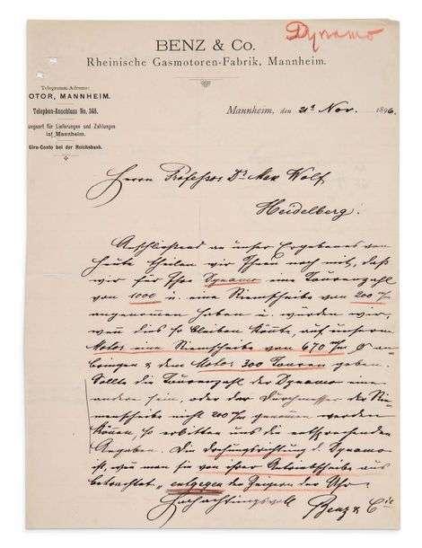 L.S. «Benz & Cie», Mannheim 21 novembre 1896, à Max WOLF à Heidelberg| 1 page in-4 à en-tête Benz & Co.