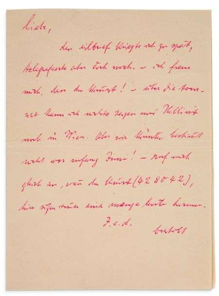 L.A.S. «Bertolt», [à Ruth BERLAU]| 1 page petit in-4 au stylo bille rouge| en allemand.