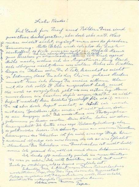 Il remercie ses enfants («Liebe Kinder !») pour l'envoi de photos, un peu sombres, mais ce qu'il ne voit pas est complété par la mémoire fraîche («Was man nicht sieht, ergänzt man aus der frischen Erinnerung»).