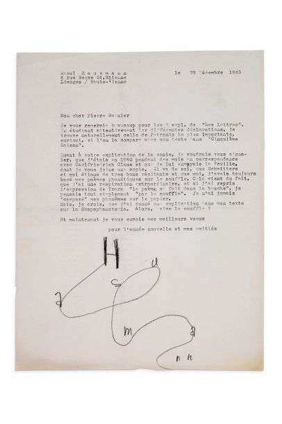 L.S. «Hausmann», Limoges 29 décembre 1963, à Pierre GARNIER| 1 page in-4 dactylographiée, signée au crayon| en français.