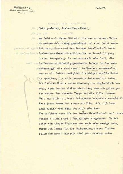 L.S. «Kandinsky», Dessau 5 janvier 1927, au galeriste berlinois Hanns KRENZ| 1 page et demi petit in-fol.