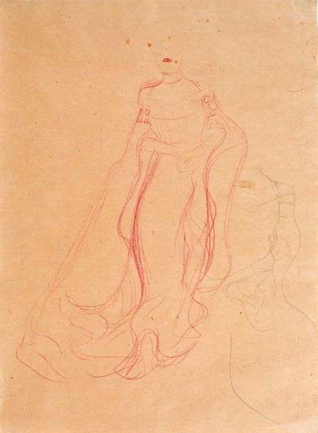 Dessin préparatoire à un portrait de femme en pied, en robe longue et cape, tenant ses mains jointes, au crayon gras rouge| le côté droit, et notamment la forme de l'épaule, est répété à la mine de plomb.