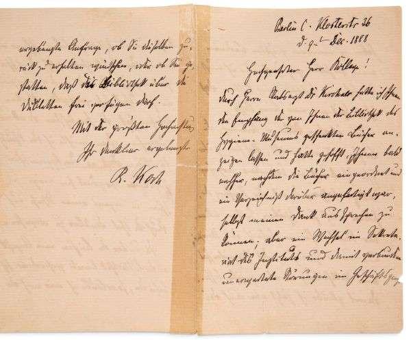 L.A.S. «R. Koch», Berlin 9 décembre 1888, à un collègue| 3 pages et demie in-8 (pli central réparé au scotch)| en allemand.
