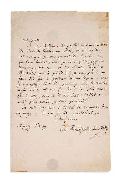 Tell [de ROSSINI], et ce sera donc cet air que je vous prierai de chanter au prochain concert| mais je crois qu'il gagnera beaucoup si vous vouliez chanter aussi le récitatif qui le précède, & je vous prie de me faire dire par le porteur de ces lignes si vous y consentez. Peut-être pourriez-vous laisser l'air aussi en la bémol (un demi-ton plus haut que le vôtre) comme il est écrit| l'effet en sera plus grand, je suis persuadé. Je suis avec une infinité de crapauds dans ma gorge & la plus grande considération votre dévoué Félix Mendelssohn Bartholdy».