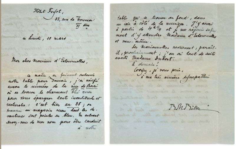 L.A.S. «RMRilke», «Hôtel Foyot» [Paris] 30 mars [1925], à Paul d'ESTOURNELLES DE CONSTANT fi ls| 2 pages petit in-4| en français.