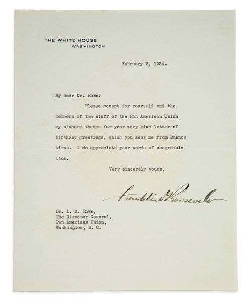 L.S. «Franklin D Roosevelt», Washington 2 février 1934, à Leo Stanton ROWE, directeur général de la Pan American