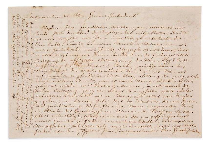 Aussi décida-t-elle de se rendre directement de Weimar à Dresde pour obtenir des plus hautes autorités, que son mari soit autorisé à rentrer en Allemagne. Comme elle avait le soutien d'une lettre du Grand-Duc de Weimar au Roi de Saxe, elle réussit à faire bien recevoir sa requête| on lui dit cependant que des actes politiques tels qu'une grâce ne pouvaient s'accomplir en moins d'un trimestre.