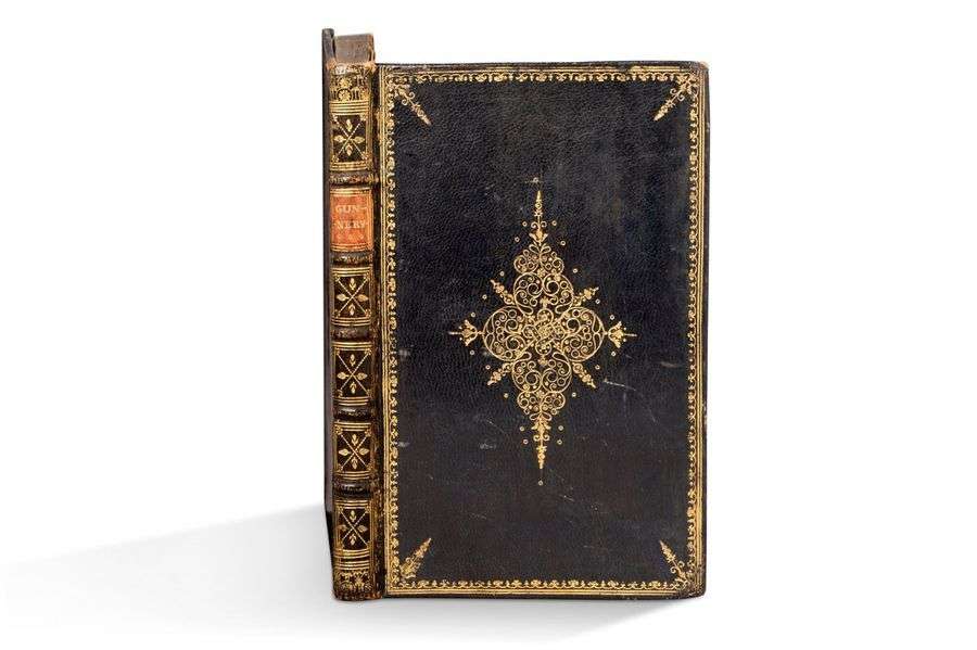 A Treatise of gunnery. Londres, William Innys, 1731. In-8, maroquin noir, double filet et roulette dorés en encadrement, petit fleuron aux angles, grand fleuron au centre dessiné aux petits fers, dos orné, pièce de titre orangée, roulette intérieure, tranches dorées (Reliure anglaise de l'époque).
