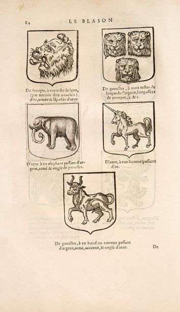 Le Blason des armoiries, auquel est monstrée la manière que les Anciens & Modernes ont usé en icelles. Paris, Rolet Boutonné, 1628.-SCOHIER (Jean). L'Estat et comportement des armes, contenant l'institution des armoiries, et méthode de dresser des généalogies. Paris, Rolet Boutonné, 1630.-MOREAU (Philippe). Le Tableau des armoiries de France. Paris, Rolet Boutonné, 1630. Ensemble 3 ouvrages en un volume in-folio, vélin souple de l'époque.
