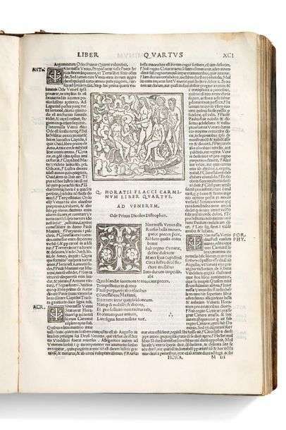 Poemata omnia: commentatibus Antonio Mancinello, Airone, Porphyrione, Joanne Baltannico, Badio Ascensio. Annotationes Aldi Manutii. Venise, Rossinellum, 1540. In-folio, plein veau brun, médaillon central estampé sur fond doré azuré aux plats, dos à nerfs (Reliure de l'époque).