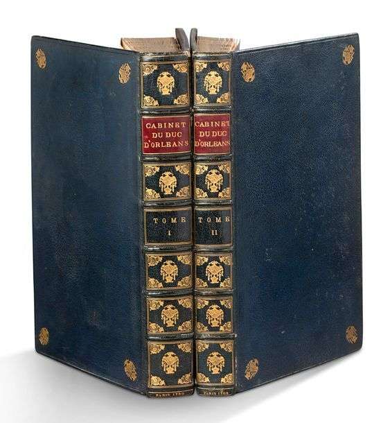 Description des principales pierres gravées du cabinet de S.A.S. Monseigneur le duc d'Orléans, premier prince du sang. Paris, l'abbé La Chau, l'abbé Le Blond, Pissot, 1780-1784. 2 volumes petit in-folio, maroquin bleu, filet à froid, fleuron doré aux angles, dos orné, pièce de titre rouge, large dentelle intérieure, doublure de papier fort orné d'un fer à l'urne aux angles, tranches dorées (Reliure anglaise vers 1880).