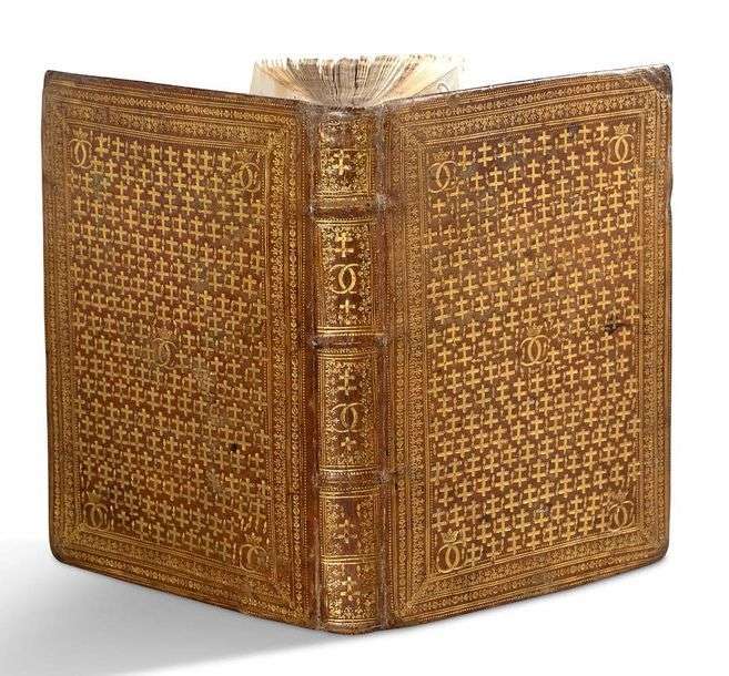 Vera jurisconsultorum philosophia. S.l.n.d. [au privilège: 1626]. In-4, maroquin brun, bordures de roulettes dorées, plats couverts de croix de Lorraine, au centre et aux angles chiffre C couronné, le dos orné des mêmes emblèmes et chiffre, tanches dorées (Reliure de l'époque).