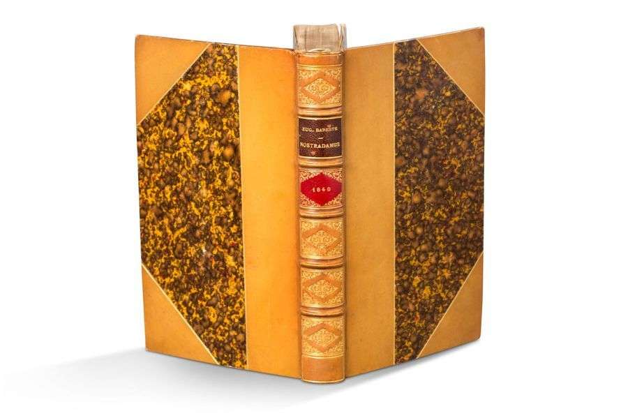 Nostradamus. Vie de Nostradamus. Histoire des oracles et des prophètes. Centuries. Explication des quatrains prophétiques. Paris, Maillet, 1840. In-8, demi-veau havane avec coins, dos orné, pièces de titre brune et de date rouge, tête dorée, non rogné, couverture (Lane delin).