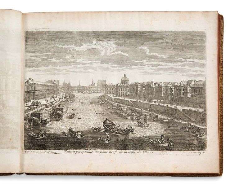 Recueil comprenant un titre gravé et 130 belles planches gravées sur cuivre montrant diverses vues de monuments et demeures royales: 26 pour Paris, 45 pour Versailles, 11 pour Fontainebleau, et 48 autres planches de vues (châteaux de Marly, Noizi, Meudon, Vincennes, Chambord, Saint-Germain-en-Laye, Saint-Cloud, Chantilly, Vaux-le-Vicomte, etc.).