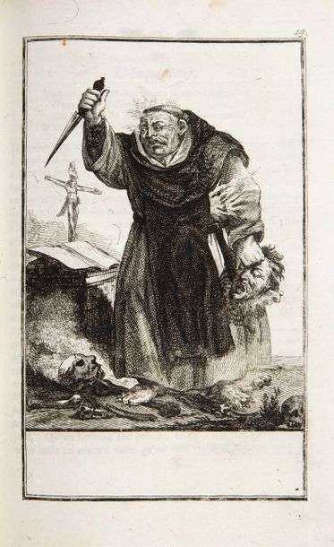 Une planche dépliante figurant L'Abrégé du faux clergé romain, et 50 figures, le tout gravé à l'eau-forte.