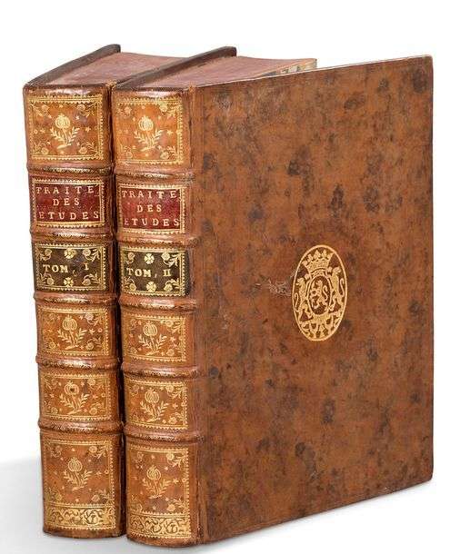 De la manière d'enseigner et d'étudier les belles-lettres par raport [sic] à l'esprit & au coeur. Paris, Veuve Estienne, 1740. 2 volumes in-4, veau marbré, triple filet à froid, armoiries au centre, dos orné, pièces de titre rouge et de tomaison verte, tranches rouges (Reliure de l'époque).
