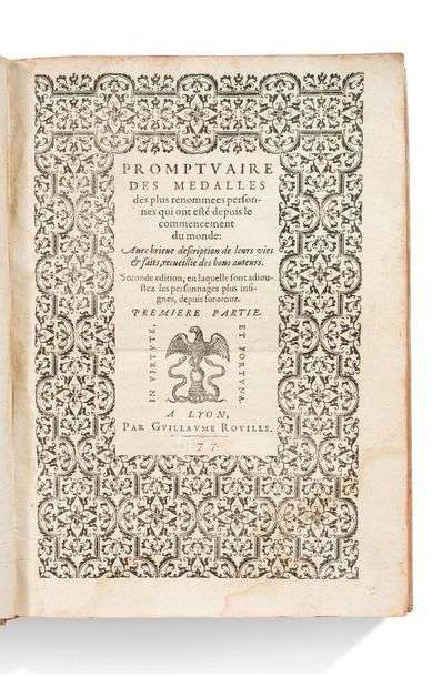 Promptuaire des médailles des plus renommées personnes qui ont esté depuis le commencement du monde: avec brieve description de leurs vies & fais, recueillie des bons auteurs. Lyon, Guillaume Rouille, 1577.In-4, plein vélin rigide, tranches rouges (Reliure postérieure).