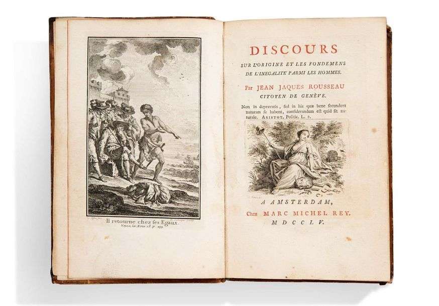 Discours sur l'Origine et les Fondemens de l'inégalité parmi les hommes. Amsterdam, Marc Michel Rey, 1755. In-8, plein veau marbré, dos lisse orné de fleurons dorés, titre doré au dos, tranches rouges (Reliure de l'époque).
