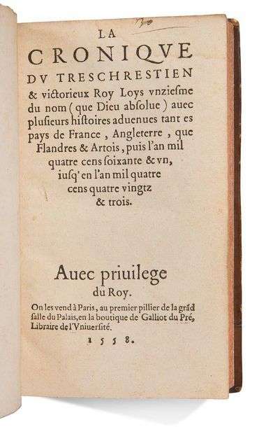 La cronique du tres chrestien & victorieux Roy Louys onziesme du nom (que Dieu absolue) avec plusieurs histoires advenues tant es pays de France, Angleterre, que Flandres & Artois, puis l'an mil quatre cens soixante & un, jusqu'en l'an mil quatre cens quatre vingtz & trois. Paris, Galliot du Pré, 1558. In-12, plein veau moucheté, dos à nerfs orné de fers dorés, pièce de titre rouge, roulette dorée sur les coupes, tranches rouges (Reliure de l'époque).
