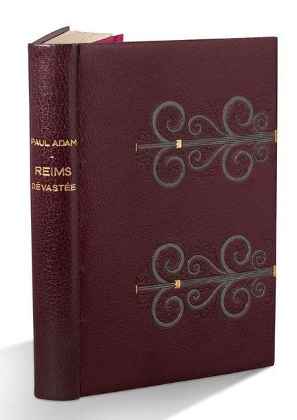 Reims dévastée. Paris, Éditions Lapina, 1930. In-4, maroquin aubergine, sur chaque plat, deux pièces de maroquin vert dessinant des pièces de ferronnerie telles que celles renforçant les vantaux d'une porte, petites pièces dorées, encadrement intérieur orné d'un rappel de ces ferronneries, listel doré en encadrement, doublure et gardes de moire bordeaux, tranches dorées sur témoins, étui (Marot-Rodde). 17 eaux-fortes originales et 23 lettrines dessinées et gravées par Charles Jouas.