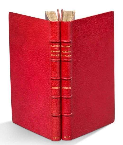 Madame Bovary. Paris, Lévy frères, 1857. 2 volumes in-8, plein maroquin rouge, dos à nerfs, coupes filetées, roulette intérieure dorée, tranches de tête dorées, couvertures vertes et dos conservés (Reliure Dupré).