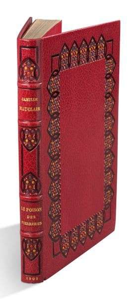 Le Poison des pierreries. Paris, Ferroud, 1903. In-4, maroquin vieux rouge, large bordure à motifs d'arabesques à froid ornée de pastilles mosaïqués en diverses couleurs et petits points dorés, dos à quatre nerfs portant le titre doré et orné de motifs à froid et mosaïqués, encadrement intérieur dessiné par un double filet doré et quatre listels bordeaux, motif d'arabesque avec pastilles mosaïquées aux angles, doublure et gardes de moire rouge, tranches dorées sur témoins, couverture et dos, étui (Ch. Septier).