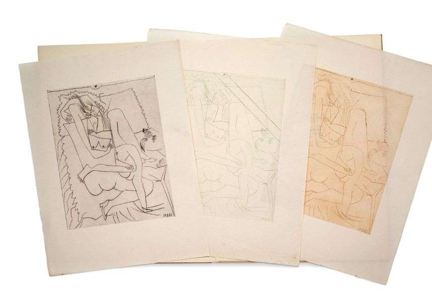 Un des 50 premiers exemplaires comportant une eau-forte originale de Picasso «Le Couple» en 3 états: une épreuve en noir, une en brun et une épreuve en vert barrée, toutes sur Chine. Seuls les grands papiers contiennent l'eau-forte non barrée.