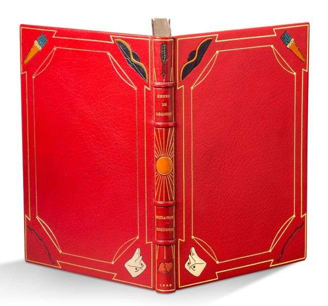 L'Initiation vénitienne. Paris, Société des amis des livres, 1929. In-4, maroquin rouge, encadrement de filets dorés, brisé aux angles, motif mosaïqué (différent les uns des autres) en écoinçon, dos à quatre nerfs orné de motifs mosaïqués, bordure intérieure, doublure et gardes de soie brochée, tranches dorées sur témoins, couverture et dos, étui (Ch. Septier).