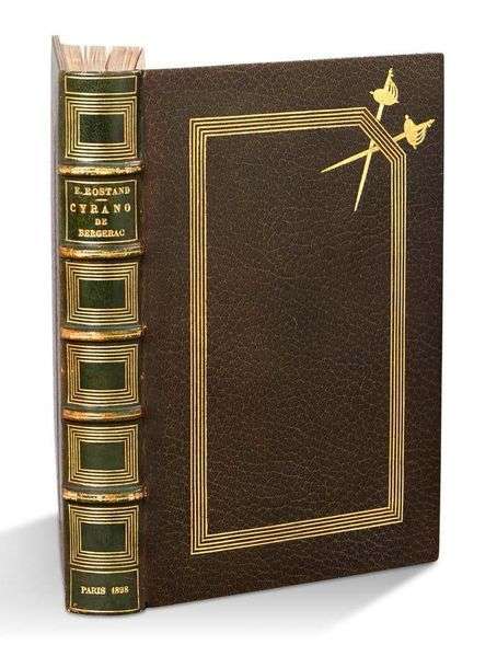 Cyrano de Bergerac. Comédie héroïque en cinq actes en vers, représentée à Paris, sur le Théâtre de la Porte Saint-Martin, le 28 décembre 1897. Paris, Charpentier et Fasquelle, 1898. In-8, plein maroquin vert, plats ornés d'un encadrement centré de cinq filets or dont l'angle supérieur extérieur est cassé et porte un jeu d'épées croisées et dorées, dos à nerfs, double filet sur les coupes, encadrement intérieur du même maroquin orné d'une guirlande dorée de raisins et feuilles de vigne, filet intérieur, tranches dorées sur témoins, couvertures vertes conservées, étui bordé du même maroquin (Reliure Pétrus Ruban datée 1898).