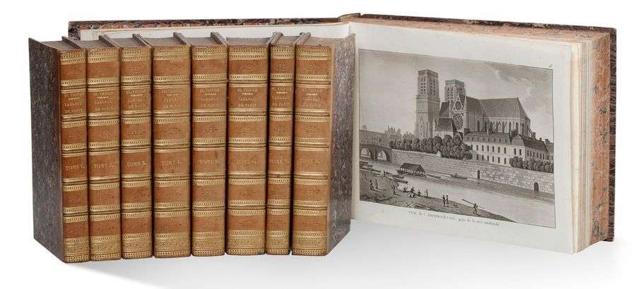 Tableau historique et pittoresque de Paris, depuis les Gaulois jusqu'à nos jours. Paris, Gosselin, 1822-1827. 7 volumes in-8 et un atlas oblong, demi-basane ocre, dos à nerfs orné, tranches jaspées (Reliure de l'époque).