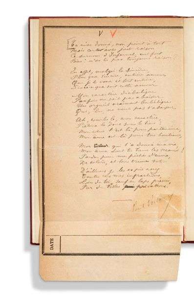 Rare exemplaire enrichi du manuscrit autographe signé de la pièce V du recueil, au verso d'une feuille de soins de l'assistance publique et de deux portraits gravés de Verlaine, l'un par Lazard, sur Watman, daté 1888, l'autre d'après David Estoppey, gravé sur bois par Maurice B[aud], tiré sur papier de Chine.