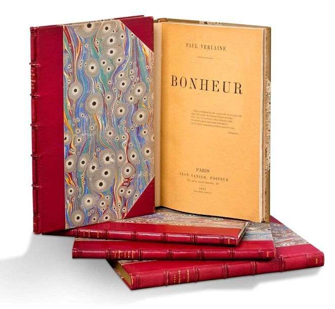 Parallèlement-Chansons pour elle-Élégies-Odes en son honneur-Bonheur. Paris, Léon Vanier, 1889-1893. 5 volumes petit in-12, 4 premiers volumes reliés uniformément, demi-veau rose à coins, dos à nerfs ornés de caissons de filets estampés à froid, têtes de tranches dorées, non rognés, couvertures et dos conservés (Reliure Huser) et dernier volume, bradel à coins en cartonnage percaline moutarde et papier marbré, dos lisse titré or, couverture conservée (Reliure non signée).