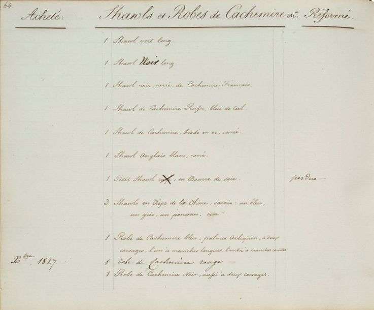 Cet inventaire de l'ensemble des toilettes de la duchesse de Guiche, ainsi que du linge de maison nous fait entrer dans l'intimité d'une demeure de qualité sous la Restauration et la monarchie de Juillet. Le comte de Marcellus évoquera la beauté de la duchesse dans Chateaubriand et son temps (1859, p. 453): «Ses tresses, en effet, ne laissaient pas admirer dans toute leur beauté et leur abondance les cheveux de la duchesse de Guiche. En 1814, je les avais vus errer plus libres sur ses épaules adolescentes un jour où mademoiselle Ida d'Orsay assistait à une revue de la garde royale. [...]». Ses toilettes de toutes circonstances se composent des plus beaux tissus de l'époque, notamment le cachemire, emblématique «shawl» du XIXe siècle.