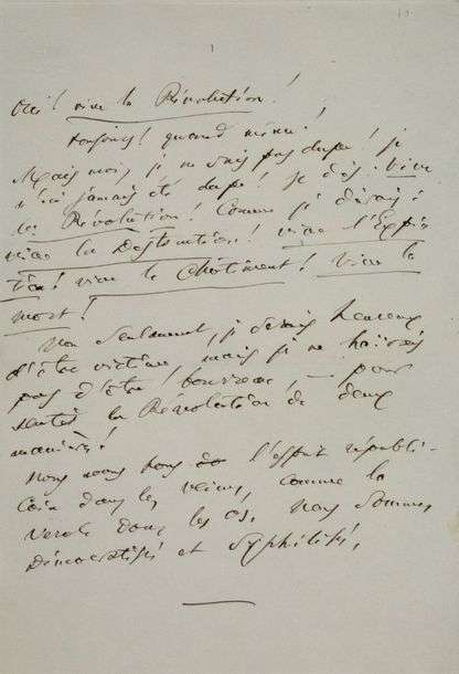 Mais moi, je ne suis pas dupe ! je n'ai jamais été dupe ! Je dis: Vive la Révolution ! Comme je dirais: vive la Destruction ! vive l'Expiation ! vive le Châtiment ! Vive la mort !