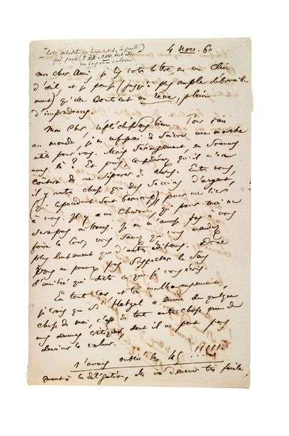 Lettre autographe signée et monogrammée à l'éditeur Auguste POULET-MALASSIS S.l., 4 novembre [18]60, 2 pages in-8 à l'encre brune sur un double feuillet de papier vélin ivoire, adresse, timbre et cachet postal du 5 décembre 1860 au verso. (Léger manque de papier au second feuillet de l'adresse sans affectation au texte).
